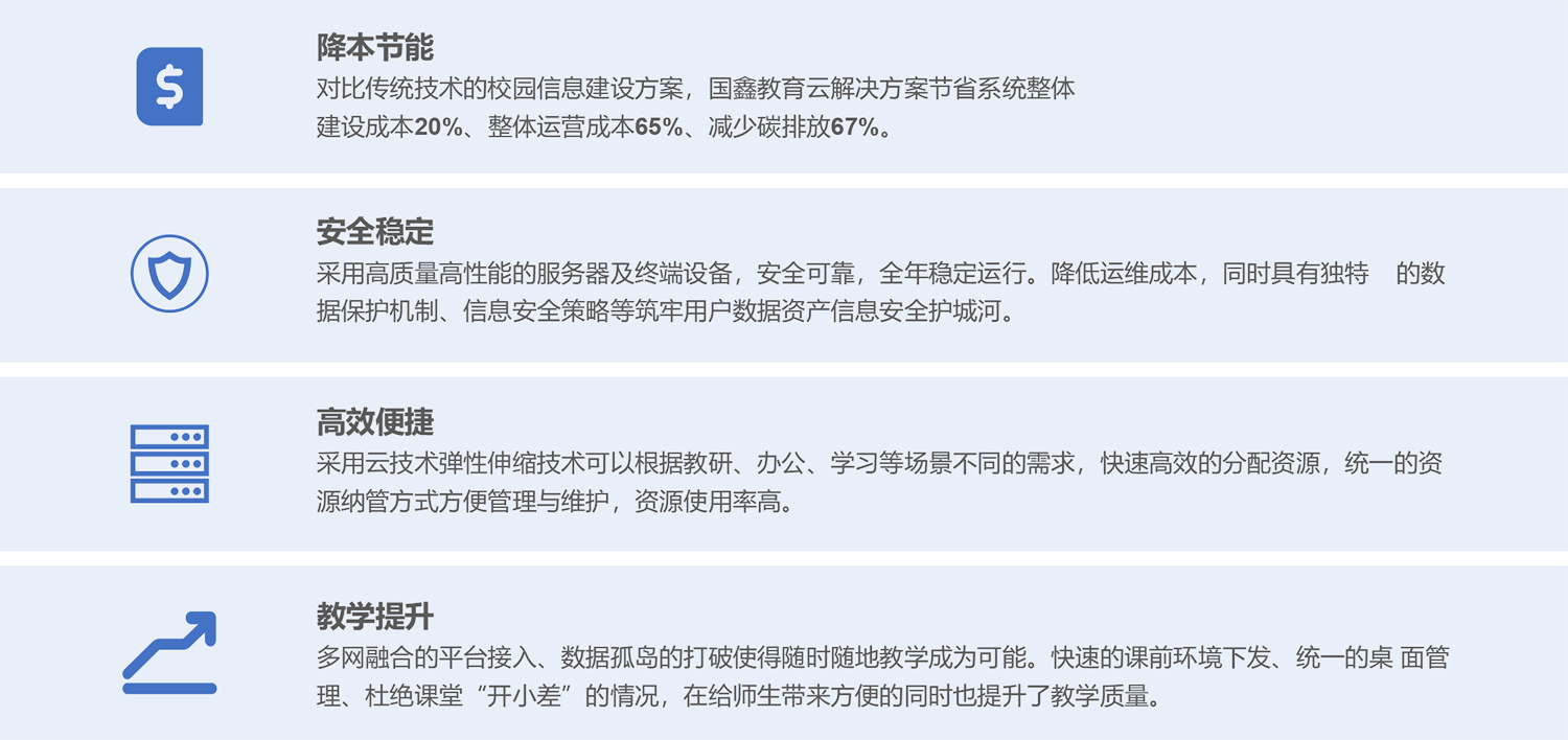 钱能钱包官网教育云解决方案是针对教育业现状及遵循政策指导方向,采用自研国产硬件及自研软件平台,推出的教育行业云平台方案。方案基于云计算技术、互联网+战略格局、契合融合创新的思路,助力校园智慧建设,更好地为教育改革和开展给予信息化基础环境支撑。